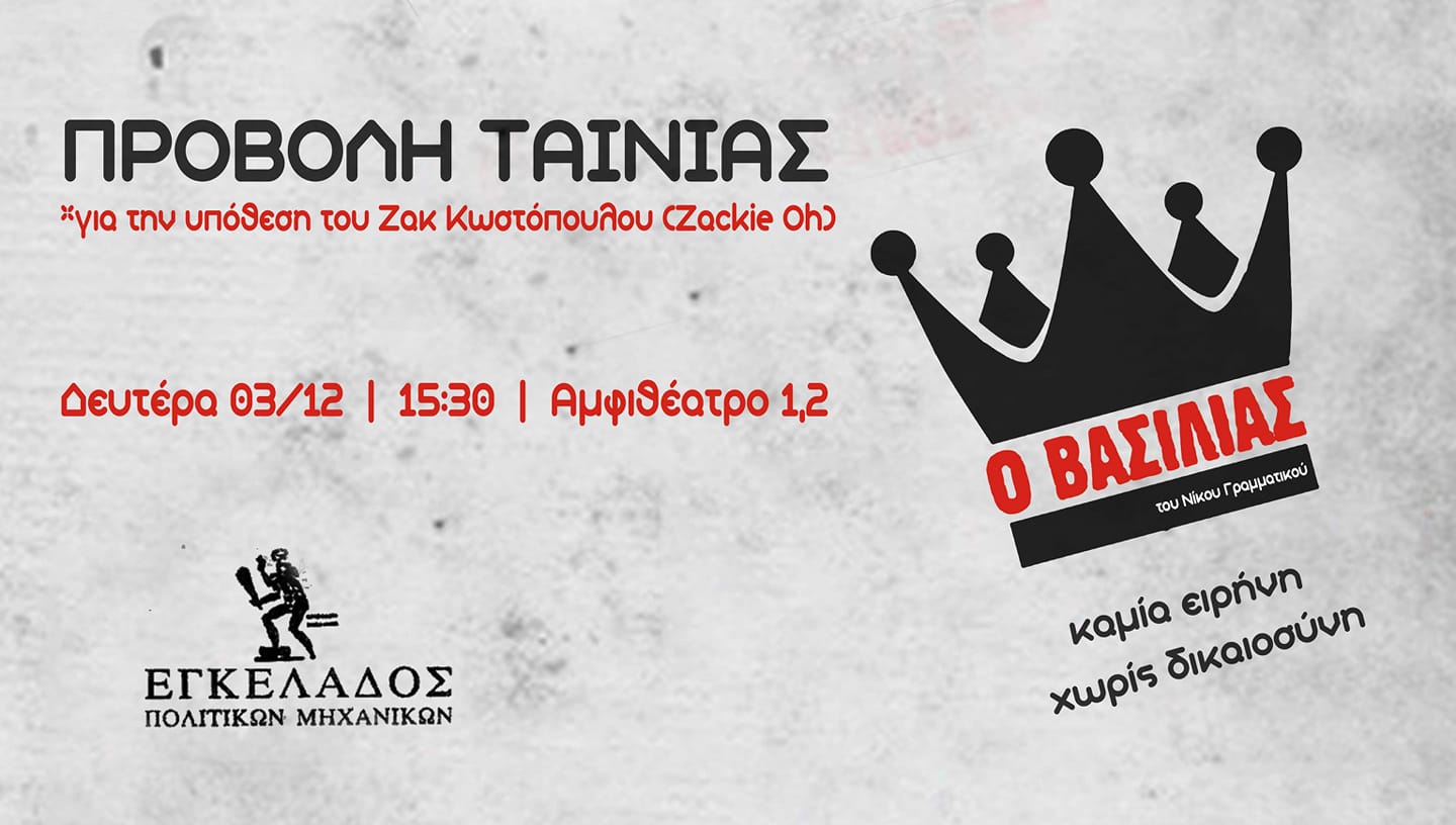 Με αφορμή την υπόθεση του Ζακ Κωστόπουλου επιλέξαμε να προβάλλουμε την ταινία "Ο Βασιλιάς" του Ν. Γραμματικού, προκειμένου να αναδειχτεί το ζήτημα της αυτοδικίας στην ελληνική κοινωνία. Σε μία περίοδο που κάποιοι επιλέγουν να πάρουν το νόμο στα χέρια τους και να σκοτώνουν στο ξύλο έναν αδύναμο άνθρωπο, που κάποιοι άλλοι παρακολουθούν τη σκηνή άπραγοι και απαθείς και που τα ΜΜΕ κάνουν γκάλοπ για την ηρωοποίηση του δολοφόνου, είναι καθήκον μας να προτάσσουμε μία άλλη πραγματικότητα. Μία πραγματικότητα που θα στηρίζεται στην αλληλεγγύη και όπου ο καθένας και η καθεμιά θα μπορεί να ζει πραγματικά ελεύθερος/η ,χωρίς καταπίεση και χωρίς να οδηγείται ,όντας αποκλεισμένος και δακτυλοδεικτούμενος από την κοινωνία, στην εξαθλίωση.