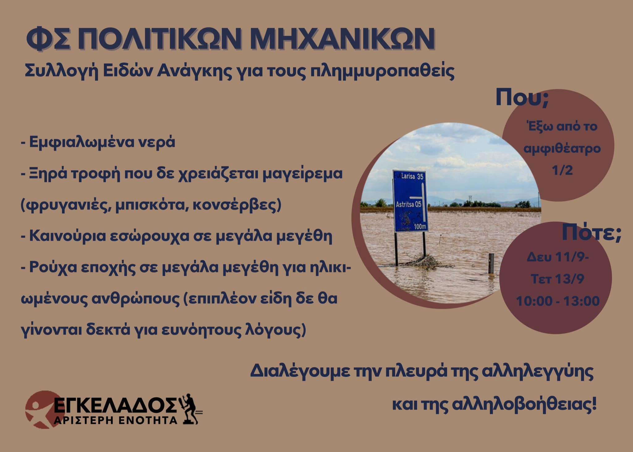 Για ακόμη μία φορά γίναμε θεατές, τις τελευταίες μέρες, πλημυρών στη Θεσσαλία που κατέστρεψαν τα πάντα στο πέρασμά τους (από δρόμους, καλλιεργήσιμες εκτάσεις, σπίτια ) και μαλιστα έφτασαν να στερούν ανθρώπινες ζωές!! Εκατοντάδες άνθρωποι είναι ακόμη εγκλωβισμένοι και πολλοί αγνοούμενοι τη στιγμή που ολόκληρα σπίτια είναι βυθισμένα κάτω από το νερό, ενώ το επιτελικο κράτος Μητσοτάκη αποδεικνύεται για μια φορά ανίκανο!