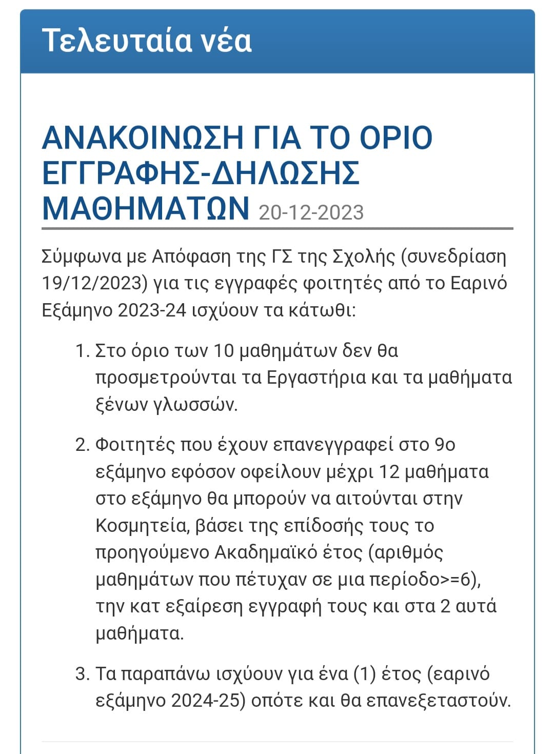 Χθες η γραμματεία της σχολής ανακοίνωσε ότι στο όριο της δήλωσης μαθημάτων πλέον δεν θα προσμετρούνται οι ξένες γλώσσες (αγγλικά, γαλλικά) και τα εργαστήρια, και πως αν περάσουμε το 5ο έτος, χρωστώντας πάνω από 10 μαθήματα θα μπορούμε πλέον να εξεταζόμαστε σε 12 (εάν όμως έχουμε περάσει το προηγούμενο έτος >=6 μαθήματα)!
