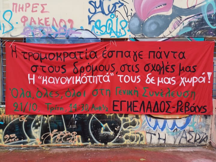 Η ίδια κυβέρνηση με μπροστάρη της τον Χατζηγεωργίου καθώς και τους πιο πιστούς υπερασπιστές της εντός της σχολής, που δεν ειναι άλλοι απο τα μέλη της ΔΑΠ-ΝΔΦΚ, μας μιλάνε για διαγραφες, κάμερες, πειθαρχικα, ιδιωτικα πανεπιστήμια και αστυνομία! Εμείς τους απαντάμε με το όραμα μας για ενα πανεπιστημιο στο ύψος των αναγκών μας και μια κοινωνια στα μέτρα των ονείρων μας! Εμεις τους απανταμε με αλληλεγγυη, συλλογικοτητα, ενότητα και αγώνες!