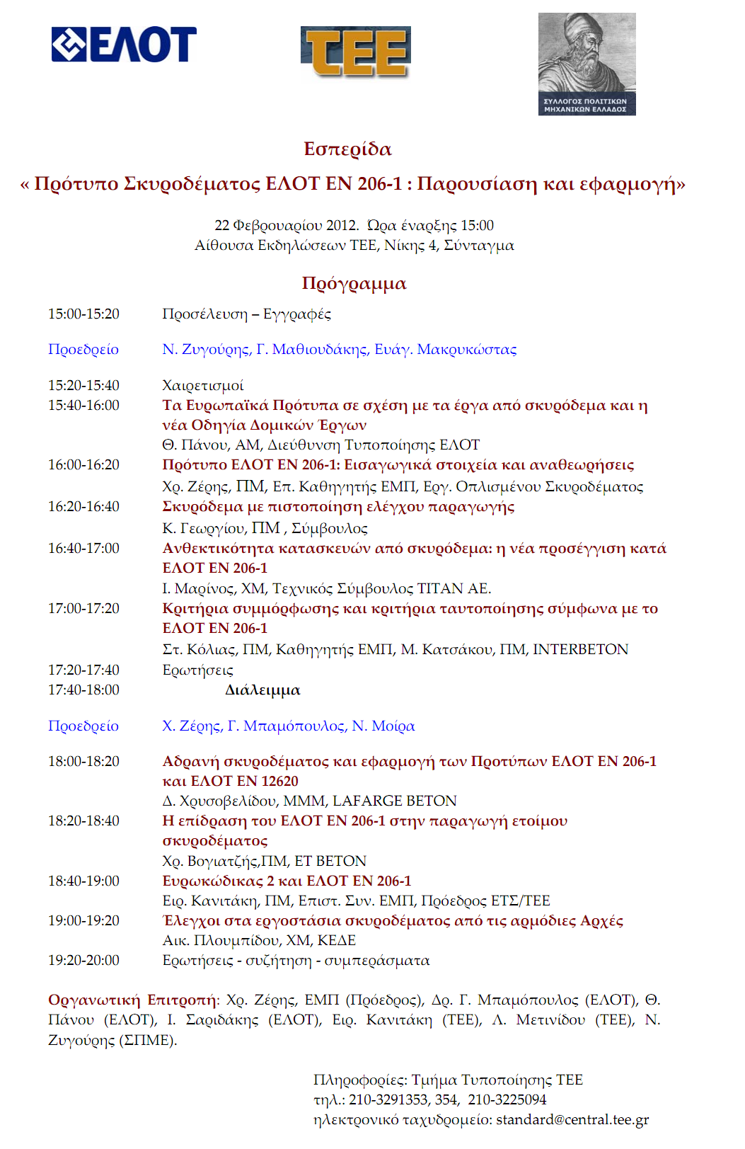 H προγραμματισμένη για τις 22/02/2012 εκδήλωση για το Ελληνικό Πρότυπο Σκυροδέματος 206-1 που αναβλήθηκε, λόγω της προγραμματισμένης συγκέντρωσης ΓΣΕΕ - ΑΔΕΔΥ στο Σύνταγμα, θα πραγματοποιηθεί στις 6 Μαρτίου 2012.
