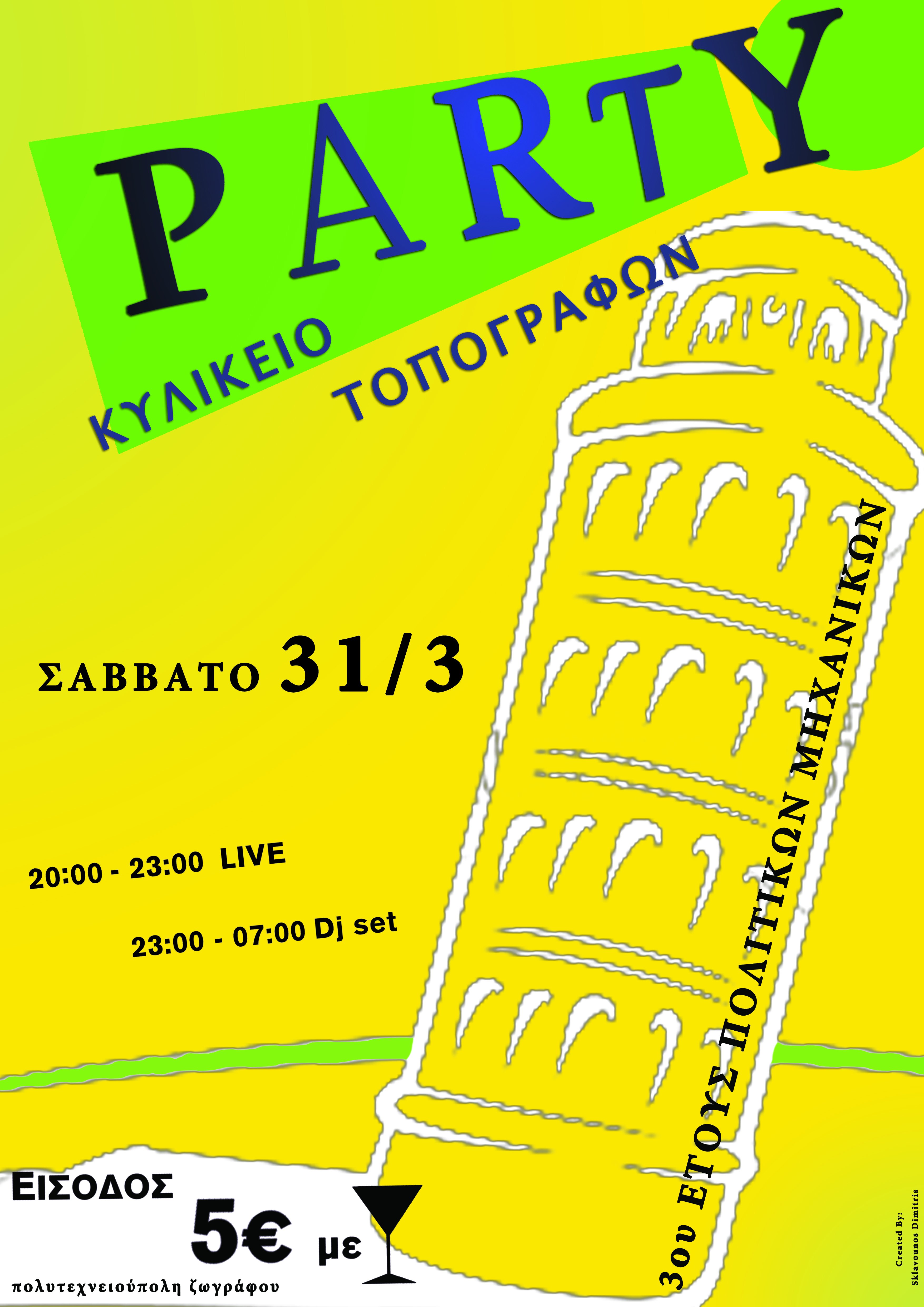 Για μια ακόμη χρονιά το 3ο έτος της σχολής μας διοργανώνει πάρτι για να στηρίξει την 9ήμερη εκδρομή του! Σας περιμένουμε όλους και μην ξεχάσετε να φέρετε και την παρέα σας!